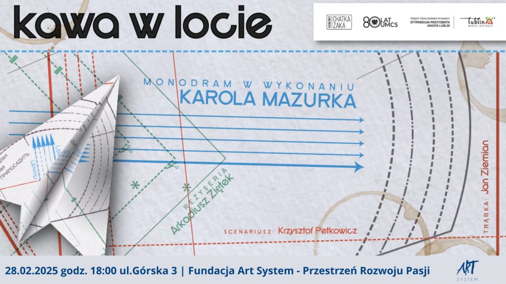 Zapraszamy na monodram „Kawa w Locie”, który odbędzie się 28 lutego 2025 r. w Fundacji ArtSystem – Przestrzeń Rozwoju Pasji w Lublinie. To wyjątkowa okazja, by zobaczyć na scenie osobistą i poruszającą opowieść o rodzinie, pasjach i tajemnicach przeszłości.
