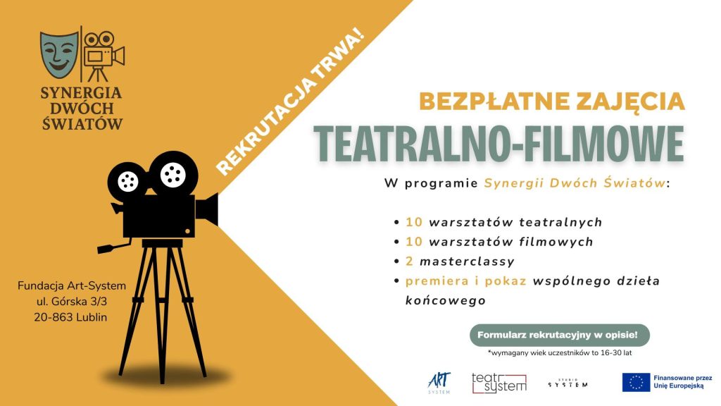 Zapraszamy młodych pasjonatów sztuki teatralnej i filmowej do udziału w projekcie „Synergia Dwóch Światów”. Jest to bezpłatny i intensywny program edukacyjny, dlatego jest skierowany do osób w wieku od 16 do 30 lat, które chcą rozwijać swoje artystyczne umiejętności i zdobywać praktyczne doświadczenie.