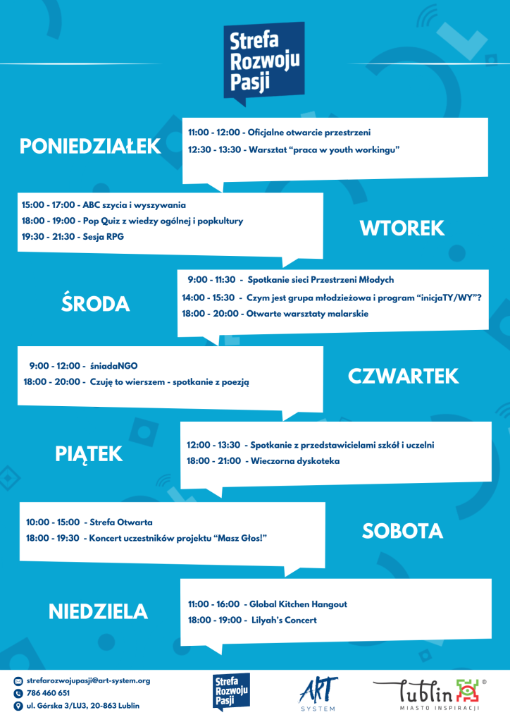 Wydarzenia odbywają się w ramach projektu „Strefa Rozwoju Pasji – Przestrzeń Młodych”.