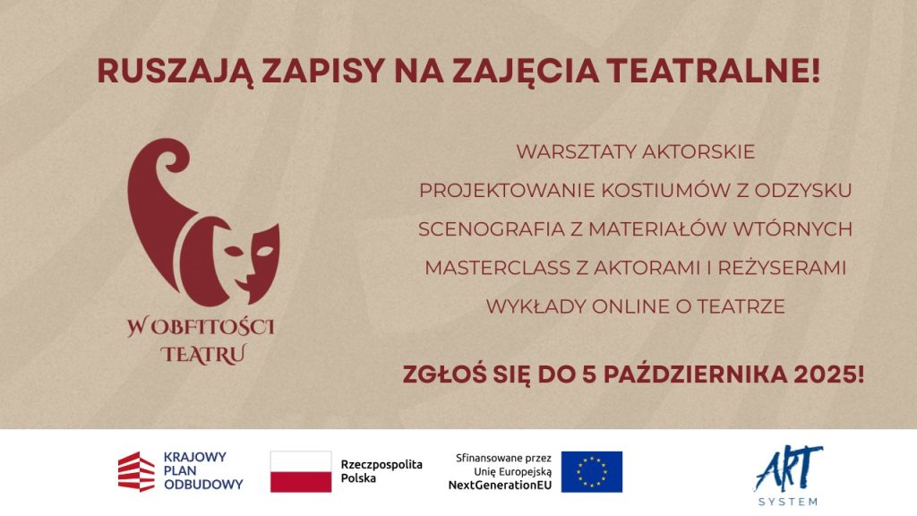Zachęcamy, by nie zwlekać – liczba miejsc jest ograniczona. Udział w projekcie „W obfitości teatru” to niepowtarzalna okazja, by zdobyć nowe doświadczenia i rozwinąć swoje artystyczne skrzydła.