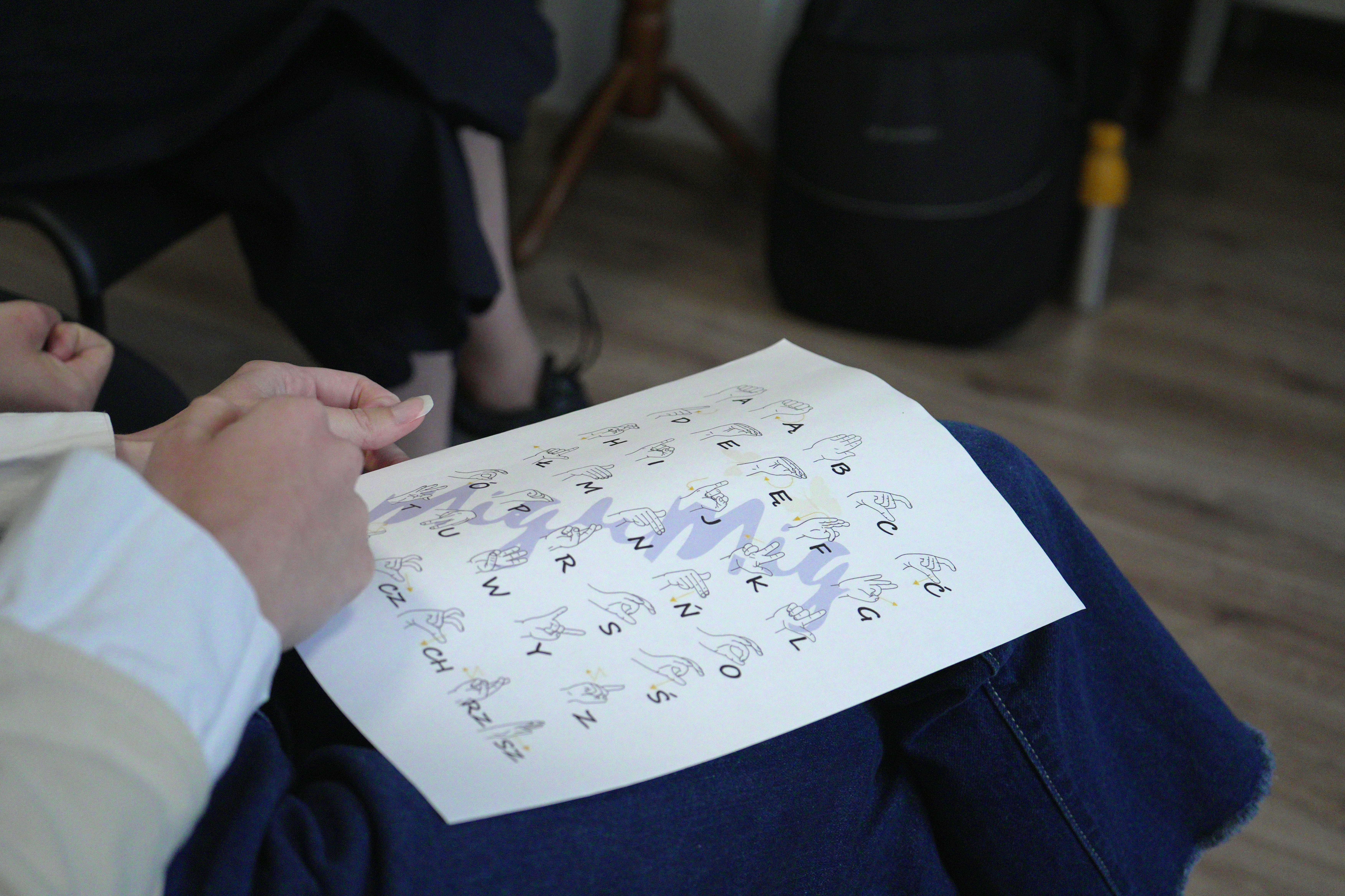 Każde spotkanie łączyło teorię z ćwiczeniami. Uczestnicy krok po kroku uczyli się nowych znaków, poznawali różnice między PJM a systemem języka miganego i zgłębiali zasady savoir-vivre w kontakcie z osobami Głuchymi. Nie brakowało zabawy – graliśmy w „statki” w języku migowym, utrwalaliśmy liczby, poznawaliśmy flagi i nazwy państw, a na finałowych zajęciach tworzyliśmy krzyżówki.